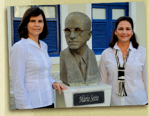 As bisnetas Paula Melo Rêgo Barros e Rossana Sette Melo Rêgo, idealizadoras e responsáveis pelo conteúdo deste site, junto ao busto de Mário Sette, na Academia Pernambucana de Letras.