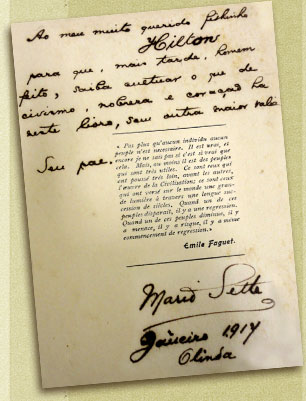 "Ao meu muito querido filhinho Hilton para que, mais tarde, homem feito, saiba cultuar o que de civismo, nobreza e coração há neste livro, sem outra maior valia. Seu pai, Mario Sette. Janeiro 1914, Olinda"