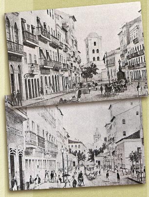 Paisagens do Recife no princípio do século XX: acima, Rua do Bom Jesus, antiga Rua dos Judeus e abaixo Rua 1º de Março, antiga Rua do Crespo (ao fundo, Praça da Independência).