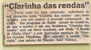 O Conto “Clarinha das Rendas”, que é novamente incluido neste volumen, foi publicado em primeira mão no livro de contos “Rosas e Espinhos”, hoje exgotado. Era dedicado a Olavo Bilac, o grande poeta brasileiro, que se tomou de carinhosa sympatia por essa sentida página litterária de Mário Sette. Numa chronica publicada na imprensa carioca, a respeito dos últimos momentos de vida de Olavo Bilac, o distincto homem de letras brasileiro, sr. Carlos Dias Fernandes, descreve o derradeiro dialogo do consagrado poeta com a irmã que lhe servia de enfermeira: