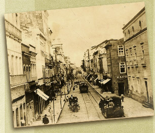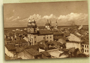 “Iam por aquelas ruas quietas, tão suas conhecidas, umas na garridice dos melhoramentos municipais, alargadas, arborizadas com lâmpadas de eletricidade, outras angustiadas de espaço, esconsas, de pedras desavindas, de passeios em escadinhas, lampião a gás, sobradões que pareciam cochilar de velhice uns se encostando nos outros... De quando em quando uma igreja caiada de amarelo ou de branco, de torres desbotadas pelos aguaceiros, de paredes descascadas pelo sol, inexpressivas de arte, olvidadas de trato, ingênuas de interiores, com vulgaridade das coisas que sobejam”. (pág.142)